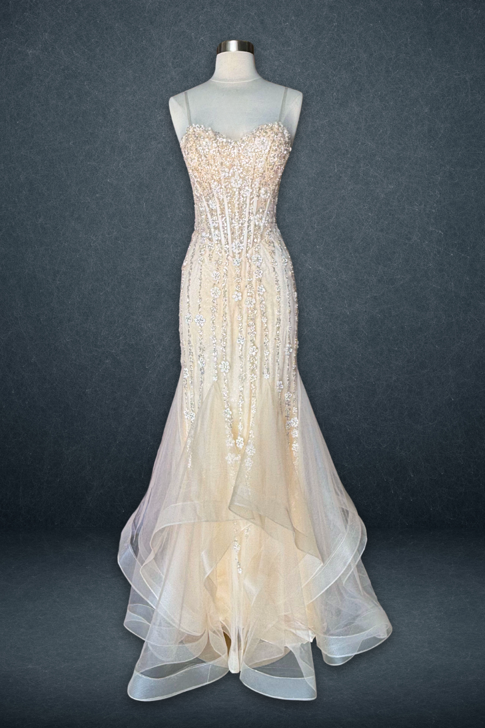 Look fabulous in this floral beaded long strapless sheer corset dress with a ruffled mermaid skirt by Amelia Couture 8002.