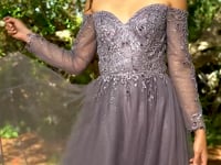 - Schulterfreies A-Linien-Kleid aus mehrlagigem Glitzertüll mit floralem Perlenmieder