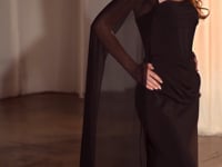 - Design: Straight neckline, long floor-grazing cape sleeves