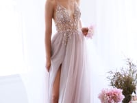 Sexy, leicht und ätherisch – dieses Kleid ist die erste Wahl für Trägerinnen, die etwas Besonderes, aber Müheloses suchen. Blumenperlen fallen schmeichelnd in den sexy V-Ausschnitt und weiten sich schwerelos am Tüllrock mit Beinschlitz.