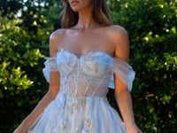 Erleben Sie die Poesie der Romantik in diesem schulterfreien A-Linien-Kleid – eine Vision ätherischer Schönheit. Mit Blumen und Schmetterlingen verzierte Applikationen zieren die Tüllschichten und erschaffen bei jedem Schritt einen Garten der Verzauberung. Das transparente, mit Stäbchen verstärkte Mieder verleiht einen Hauch von Raffinesse, während die schulterfreien Ärmel aus Tüll eine skurrile Anmut hervorrufen. Es ist nicht nur ein Kleid; es ist eine Leinwand, auf der sich Liebe und Stil verflechten und jede flatternde Verzierung eine Geschichte zeitloser Eleganz erzählt. Treten Sie ein in eine Welt, in der Träume fliegen, und lassen Sie die Schönheit der Blumen- und Schmetterlingsdetails jede Ihrer Bewegungen in einen Tanz der Verzauberung verwandeln.