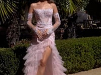 Tauchen Sie ein in sinnliche Eleganz mit diesem figurbetonten, trägerlosen Meerjungfrauenkleid – eine Ode an Verführung und Raffinesse. Die mit Spitze verzierten Applikationen zieren jede Kurve und schaffen einen Anblick unwiderstehlicher Bezauberung. Das strukturierte Oberteil mit geradem Ausschnitt verleiht einen Hauch von kühner Anmut, während der mehrlagige, gerüschte Rock einen fesselnden Tanz aus Stoff erzeugt. Ein gewagter Beinschlitz lädt bei jedem Schritt zu einem Hauch von Geheimnis ein. Das Ensemble wird durch passende Spitzenhandschuhe vervollständigt – ein sinnlicher letzter Schliff. Es ist mehr als ein Kleid; es ist ein Ausdruck von Glamour und Verlangen und lädt Sie ein, das Rampenlicht mit unbestreitbarer Raffinesse und Charme zu umarmen.