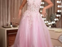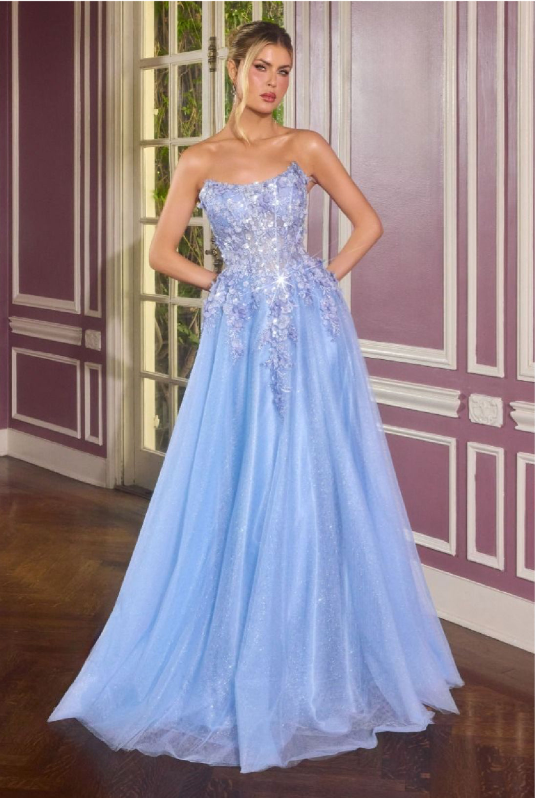 Designed to enchant, this ball gown features a scoop neckline and a beautifully embellished bodice adorned with dimensional floral appliqué that catches the light from every angle. The shimmering tulle skirt flows into a full A-line silhouette, creating a dreamy, fairytale effect with every step. Finished with a lace-up corset back for customizable structure and support, this gown offers the perfect blend of romance and elegance—ideal for prom, or any unforgettable celebration.
