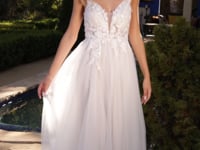 Erwecken Sie Ihre Märchenhochzeit in diesem traumhaften Brautkleid in A-Linie zum Leben. Dieses Kleid aus Lagen luxuriösem Tüll ist mit perlenbesetzten Spitzenapplikationen und einem tiefen V-Ausschnitt versehen. Ein durchsichtiger Spitzenrücken bedeckt die Rückenmitte.