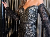 Wir präsentieren das raffinierte Kleid mit Glitzerprint im Meerjungfrauen-Stil – eine modische Wahl für stilbewusste Frauen. Dieses schulterfreie Kleid im Meerjungfrauen-Stil ist mit einem glitzernden Art-Deco-Print und einer schwarzen Tüllauflage für zusätzliche Dramatik verziert und hinterlässt garantiert Eindruck. Es ist in einem dezenten Nude-Ton gefüttert und verfügt über Manschetten aus Kunstfedern, die einen Hauch von Klasse und Eleganz ausstrahlen. Der V-Ausschnitt ist mit einem dünnen Satingürtel in Schwarz versehen, der den perfekten letzten Schliff verleiht. Dieses glitzernde Stück ist perfekt für besondere Anlässe oder den Alltag und wird garantiert ein Statement setzen. Lassen Sie Ihrer Kreativität freien Lauf – für alle Frauen, die wissen, dass es bei Mode nicht nur um Stil, sondern auch um Haltung und Anmut geht!