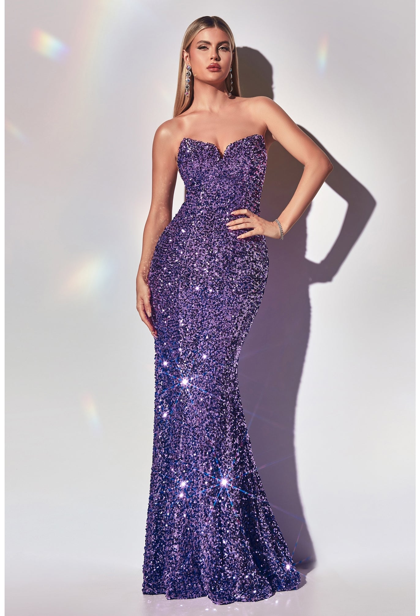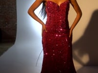 Dieses mit Pailletten verzierte Kleid hat eine trägerlose, figurbetonte Silhouette, einen spitzen herzförmigen Ausschnitt und transparente Seitenteile. Die individuelle Passform wird durch eine Schnürung auf der Rückseite erreicht, die die perfekte Größe ermöglicht.