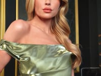 This breathtaking ball gown features an off-the-shoulder neckline and a pleated waistline that accentuates the structured bodice. Crafted from layered liquid organza, the voluminous skirt flows with graceful movement and ethereal shine. Perfect for black tie affairs or a mother of the bride moment, it captures elegance with every step.