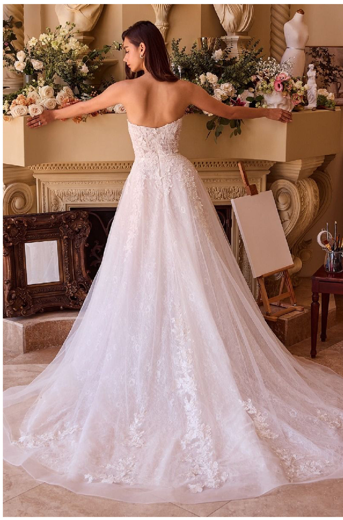 - Design: Deep sweetheart strapless neckline, floral lace applique