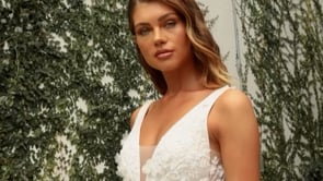 El vestido Gardenia es un vestido de gala de tul en capas con un motivo floral de brillo de diamantes que gotea por todo el vestido. Las flores de organza en 3D añaden profundidad de alta costura a la prenda, y brillantes flores de diamantes brillan contra el forro beige francés. El corpiño presenta un escote en V ilusión con un lado transparente y una espalda en V profunda. La falda tiene forma de A con crinolina para sostener la silueta.