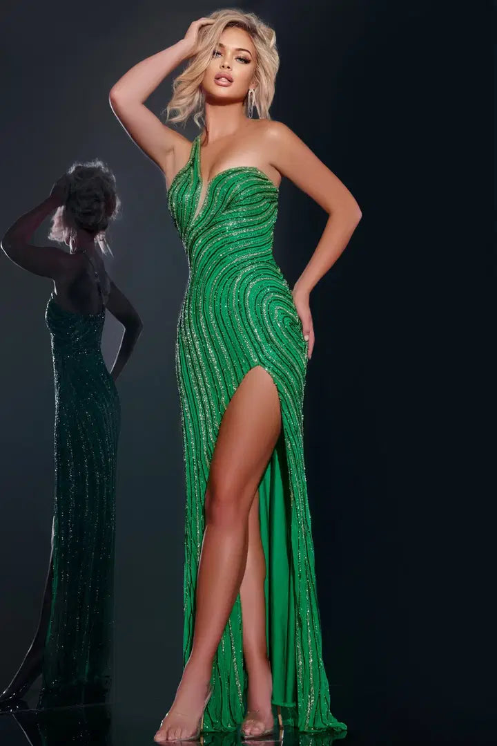 This stunning green gown beautifully combines elegance and allure. The dress features a floor-length design with a figure-hugging silhouette that gracefully flares out from the knees. A carefully crafted asymmetric neckline gracefully accentuates the shoulders, complemented by a single shoulder strap. The dress boasts an eye-catching all-over sequin pattern in swirling lines, adding a touch of glamour. A daring high slit enhances the sophisticated look, offering ease of movement.
