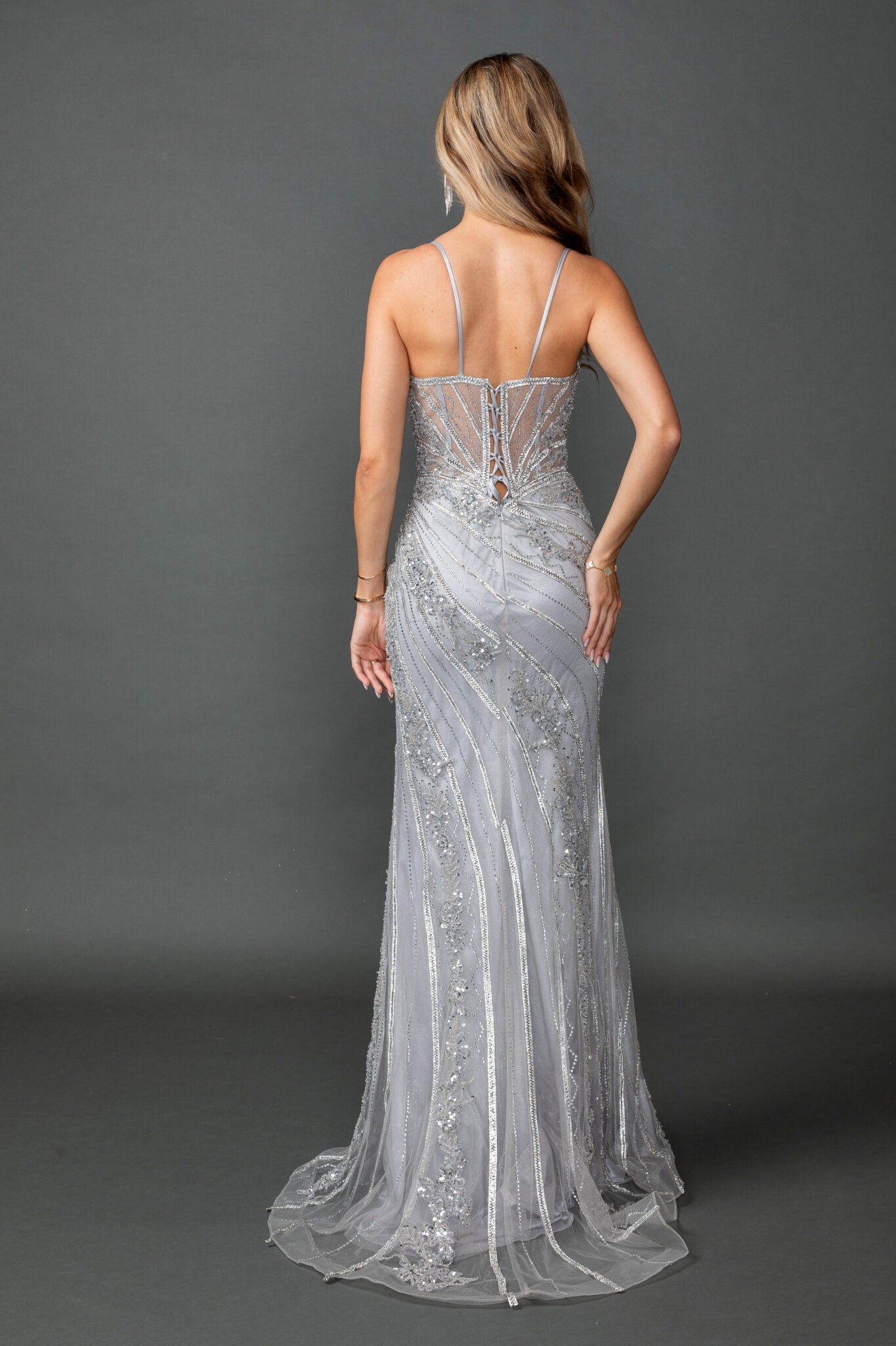 - Fabric & Material: Sheer lace & beaded appliqués