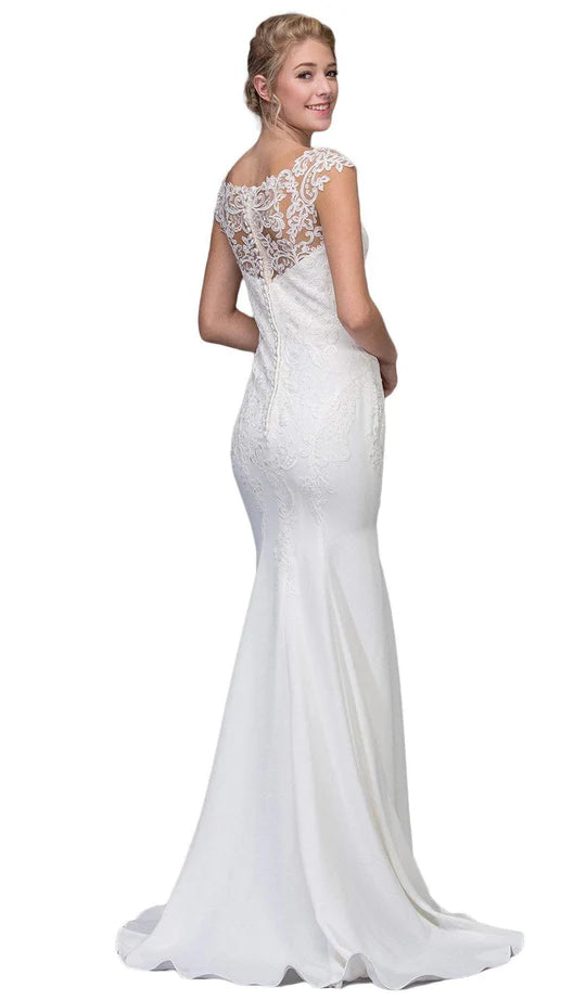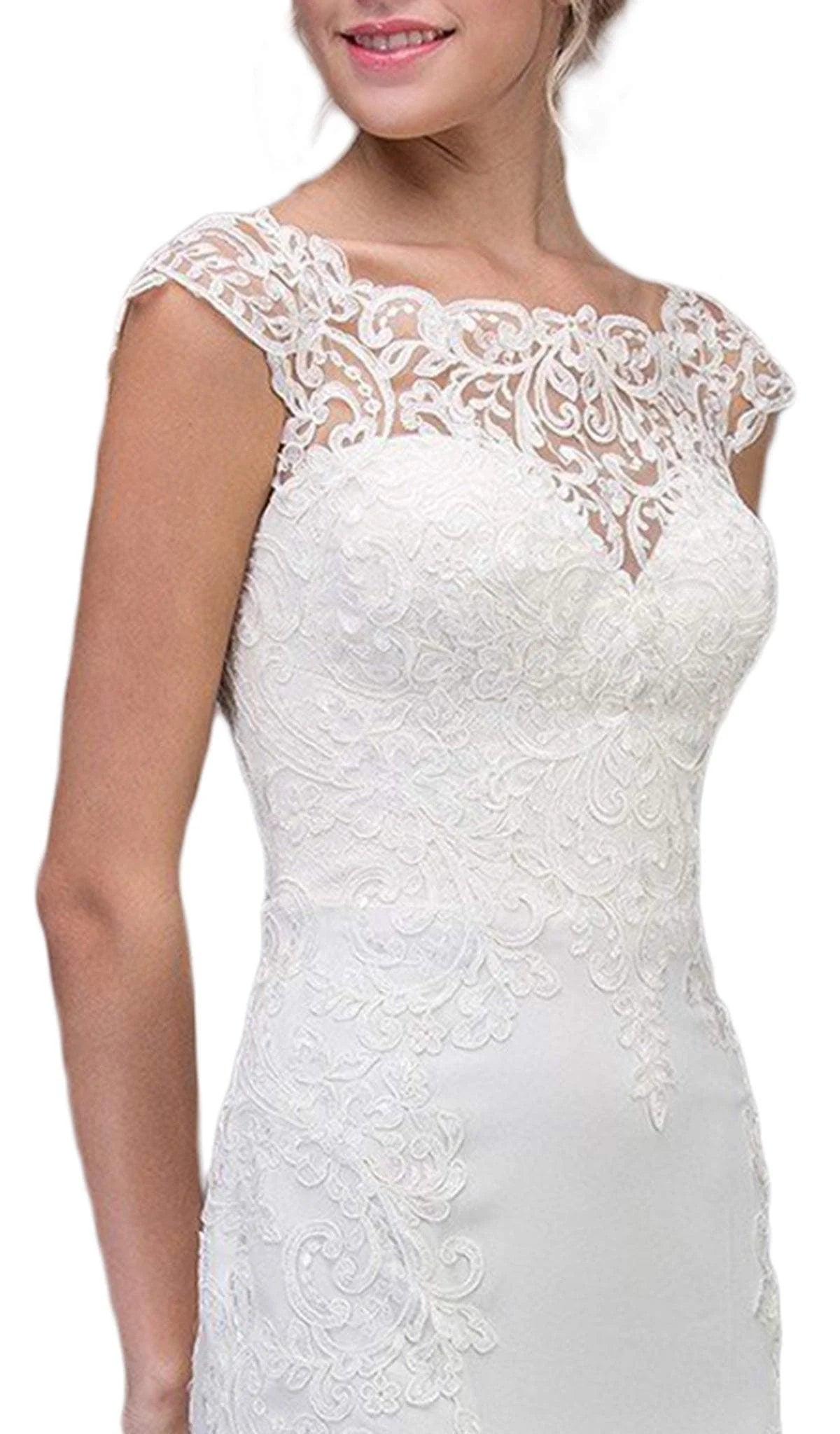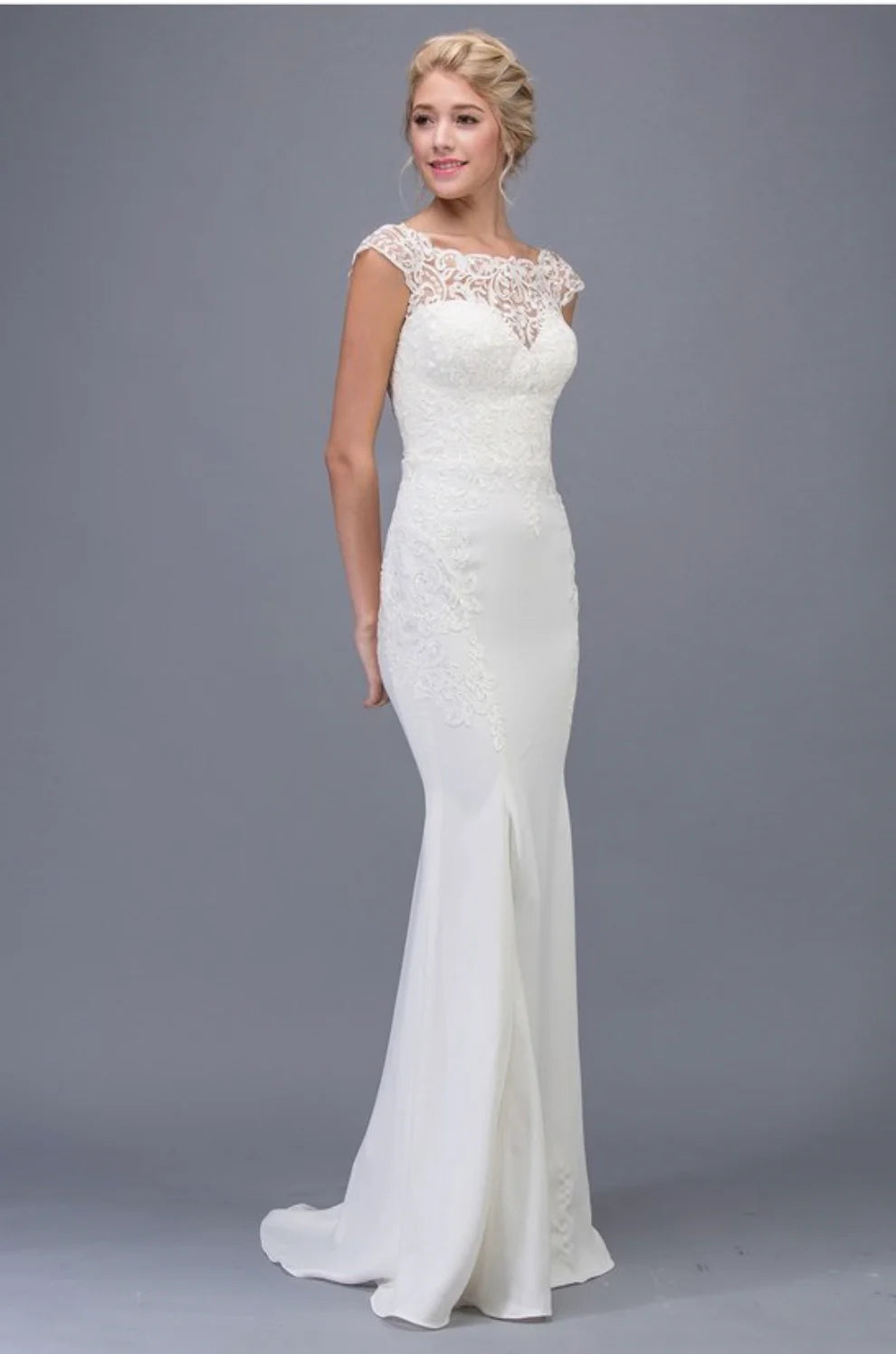 Elegante y romántico con escote barco ilusión y manga japonesa. El corpiño con forro de corazón está adornado con apliques de encaje y presenta botones cubiertos que se arrastran por la espalda. El corpiño ajustado da paso a una falda tubo de satén de longitud completa que termina en una cola amplia. Brilla con el brillo de siempre con este fascinante vestido de Eureka.
