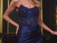 This fitted gown showcases a strapless scoop neckline and a dazzling beaded bodice, perfectly paired with a satin glitter skirt for added sparkle. The structured corset bodice with a lace-up back offers both support and an elegant fit, complementing the sophisticated leg slit. Ideal for prom, formal gatherings, or black tie events, this dress delivers a flawless blend of glamour and refinement.