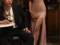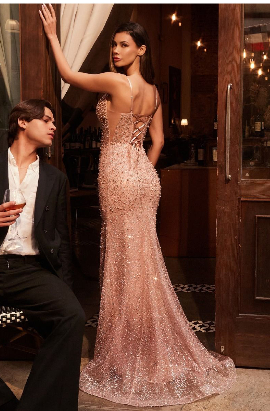 This A-line dress combines grace and charm with its deep V-neckline and three-quarter bell sleeves on an intricately detailed lace bodice. The layered glitter flocked tulle skirt flows beautifully, creating a timeless silhouette perfect for formal occasions. With a structured bodice and a full, airy skirt, it’s an elegant choice for mothers of the bride or modest celebrations.