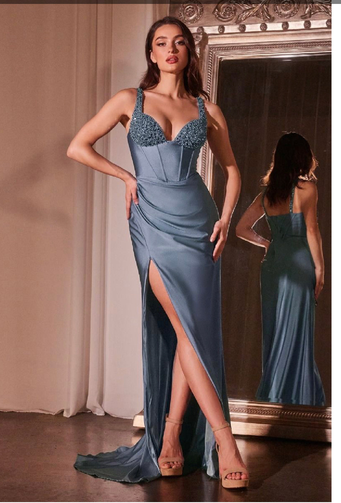 Elevate your elegance in this exquisite fitted gown that effortlessly combines sophistication and allure. The beaded bust cups and straps add a touch of glamour, framing your neckline with timeless beauty. A boned waistline ensures a flattering fit, accentuating your silhouette with grace and style. The gathered hip line adds a hint of texture and movement, creating a captivating and feminine look. Embrace the freedom to stride with confidence, courtesy of the leg slit that adds a dash of allure and showcases your every step. This gown is not just an outfit; it's a statement of poise and glamour, perfect for any special occasion where you want to exude confidence and captivate attention. Step into this masterpiece and let your beauty shine, leaving an indelible impression wherever you go.