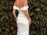 This fitted dress features an off-the-shoulder sweetheart neckline with a gathered waistline and sleek leg slit, made from stretch neoprene for a modern touch. The structured bodice, pleated hipline, and lace-up corset back ensure a flawless fit that enhances your silhouette. Perfect as a simple bridal dress, reception gown, or for a formal white party, this design is effortlessly chic and elegant.