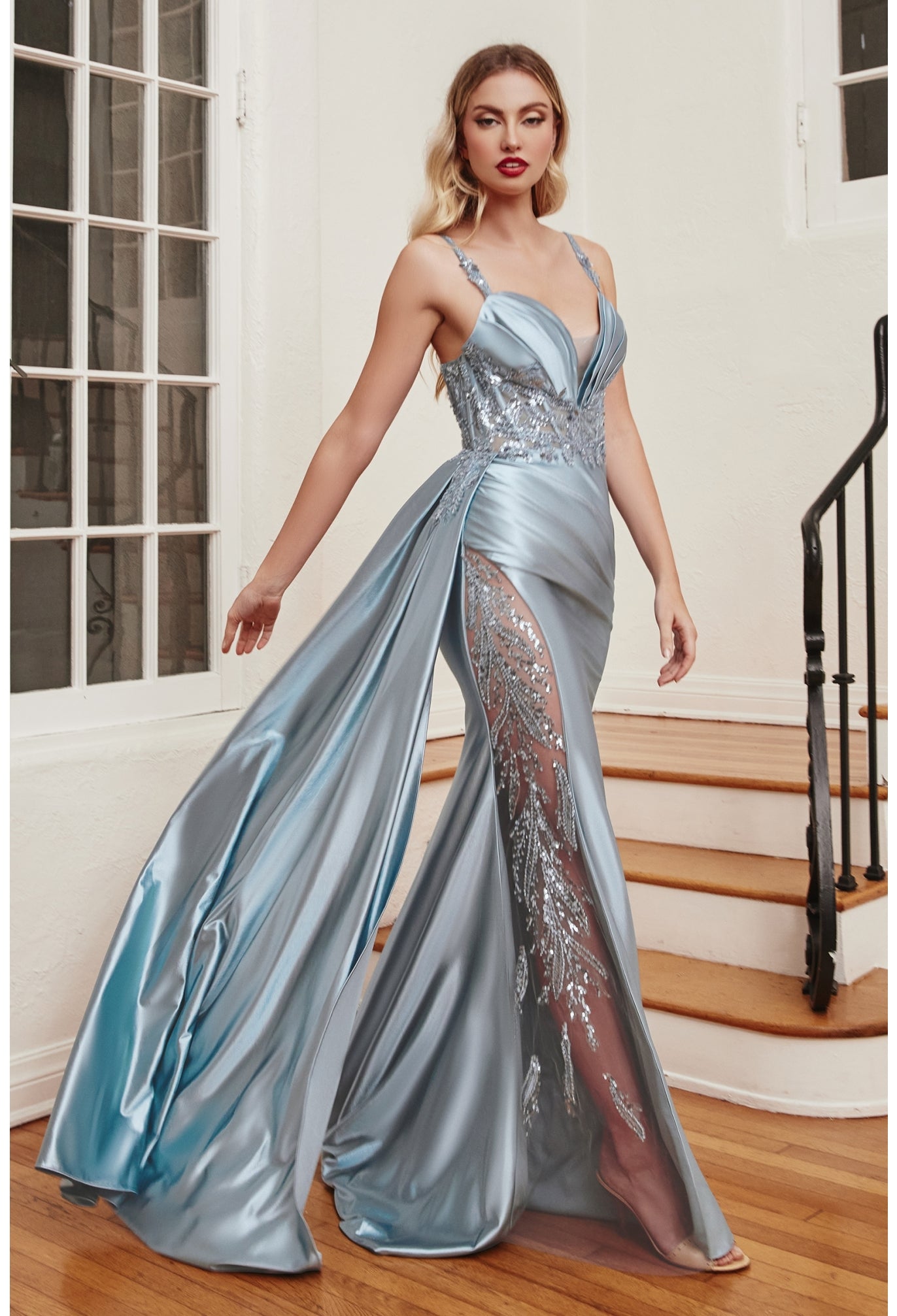 - Falda ajustada hasta el suelo con abertura lateral transparente en la pierna, fajín lateral y cola amplia