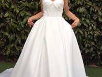 This luxe satin ball gown features a strapless sweetheart neckline with a boned bodice, offering a beautifully structured fit. The pleated bustline and gathered A-line skirt cascade into a short train, adding a touch of classic elegance to your bridal look. Perfect for your wedding day, this gown combines timeless sophistication with modern romance.