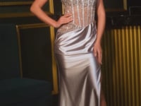 This fitted dress features a strapless sweetheart neckline and a stunning beaded corset bodice, creating a glamorous and sophisticated look. The satin skirt flows into a flattering fit-and-flare silhouette, with a leg slit for a subtle touch of allure. Perfect for prom, formal events, or black-tie occasions, this gown combines elegance with modern style for a show-stopping effect.