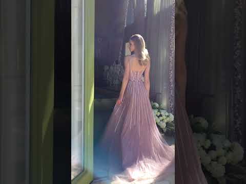 The v-neckline bodice is held up by jewel accented spaghetti straps.