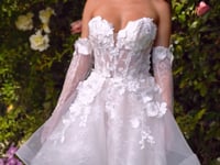 - Design: Sweetheart strapless neckline, floral adorned appliqué & removable matching gloves