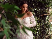 This soft A-line dress features a sweetheart off-the-shoulder neckline and long sleeves adorned with delicate Chantilly lace and a scalloped eyelash lace hem. The A-line silhouette offers a graceful and flattering fit, making it perfect for a wedding reception, engagement photoshoot, or rehearsal dinner. Embrace timeless elegance with this beautifully detailed dress, designed to make every special occasion unforgettable.