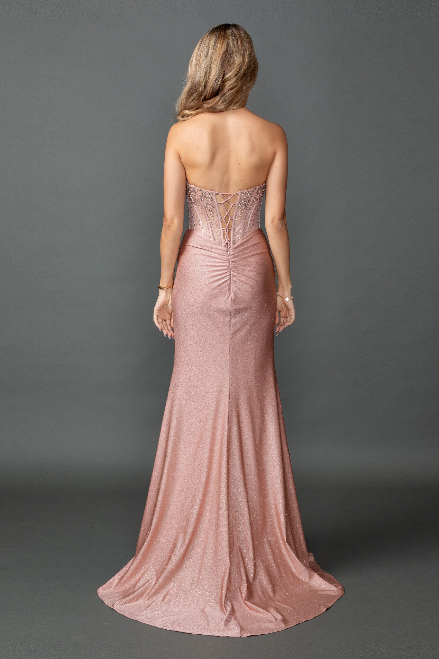 Designed to captivate, this glamorous gown showcases a sleek fitted silhouette crafted from lustrous satin that drapes effortlessly over the body. The strapless neckline highlights a structured corset bodice adorned with intricate embellishments, adding radiant sparkle and dimension. Soft draping enhances the waistline, while a daring high slit reveals just the right amount of leg for a bold, confident finish. Completed with a sweeping train, this gown blends elegance and drama, making it a stunning choice for prom, pageants, or any formal affair where making an entrance is everything.