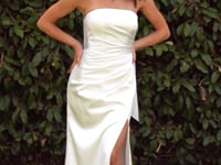 This strapless fitted satin dress features a straight neckline and a structured bodice for enhanced support, complete with a corset back closure. The gathered waistline, accented by a removable matching sash, flows elegantly into a leg slit, adding a touch of allure. Perfect for bridesmaids or a destination bride, this versatile gown combines timeless style with modern sophistication.