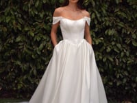 - Design: Strapless sweetheart neckline, boned bodice, short train