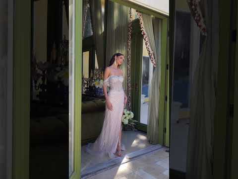 Decorated with jewel trim, this fitted dress has a sweetheart neckline, mesh bodice that connects to a slitted, floor-length skirt. The neckline is embellished with beads, sequins, and jewels that connect to the off-shoulder straps that also have jewel fringes around the edges. The bodice has a lace-up back that helps with the fitted look. The structured hem skirt is patterned with jewel trim that helps emphasize the slit on the side of the skirt.