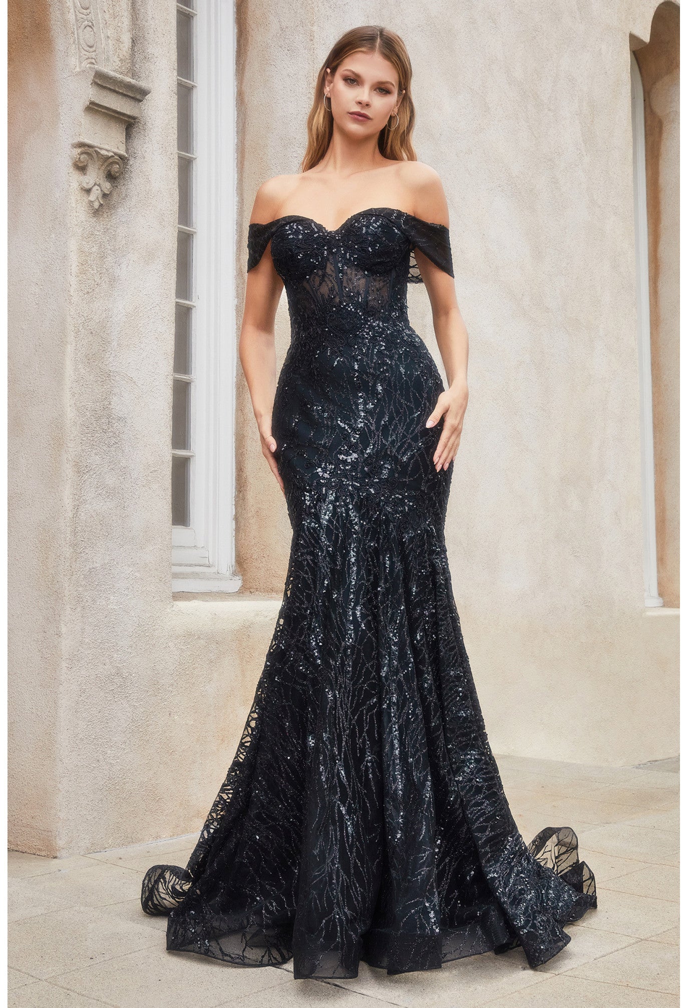 This fitted mermaid off the shoulder gown is both captivating and alluring for any formal event. The dress is made from a sequin lace that shimmers and sparkles in the light. The off-the-shoulder design adds a touch of glamor and sexiness to the gown. A sheer corset bodice contours the waist and creates a curve-hugging silhouette. The horsehair trimmed hem adds volume and fullness to the tail of the dress.