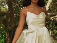 The perfect dress for the modern bride or bridesmaid, its elegant form is cut from fluid satin to ensure a smooth drape. The bias cowl neckline is suspended from delicate tie fastening spaghetti straps that are adjustable for ultimate comfort and ease. The skirt overlaps at the waist seam to create a dramatic leg opening and flows to a sweeping A-line hem.
