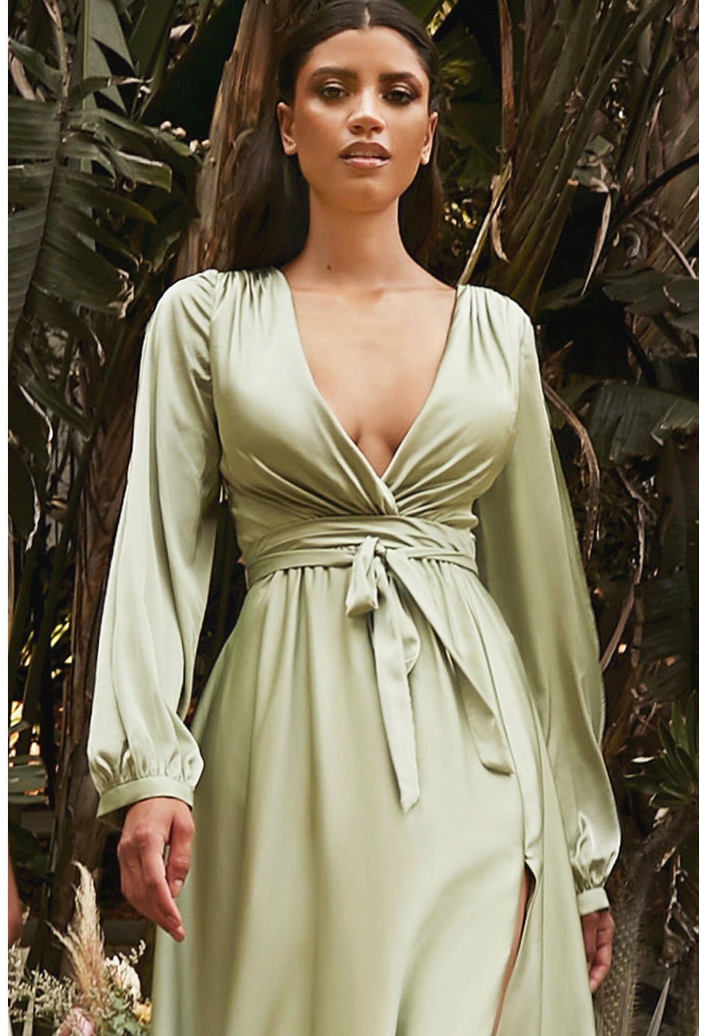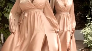 Elegance and beauty, this soft satin gown features a long blouson sleeve, pleated wrap around bodice and deep V-neckline. The A-line skirt features a high slit for added elegance.