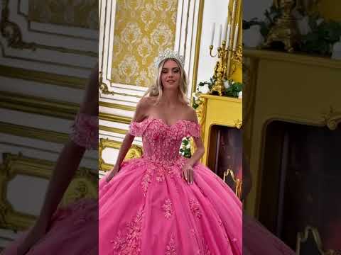 This ball gown features off-the-shoulder straps seamlessly connected to a V-neckline sheer corset bodice. The bodice and straps are richly embellished with 3D floral appliqués, beads, embroidery, jewels, sequins, and glitter, creating a textured and opulent look. These intricate embellishments are thoughtfully placed throughout sections of the skirt, while a glitter underlayer lines the entire gown.