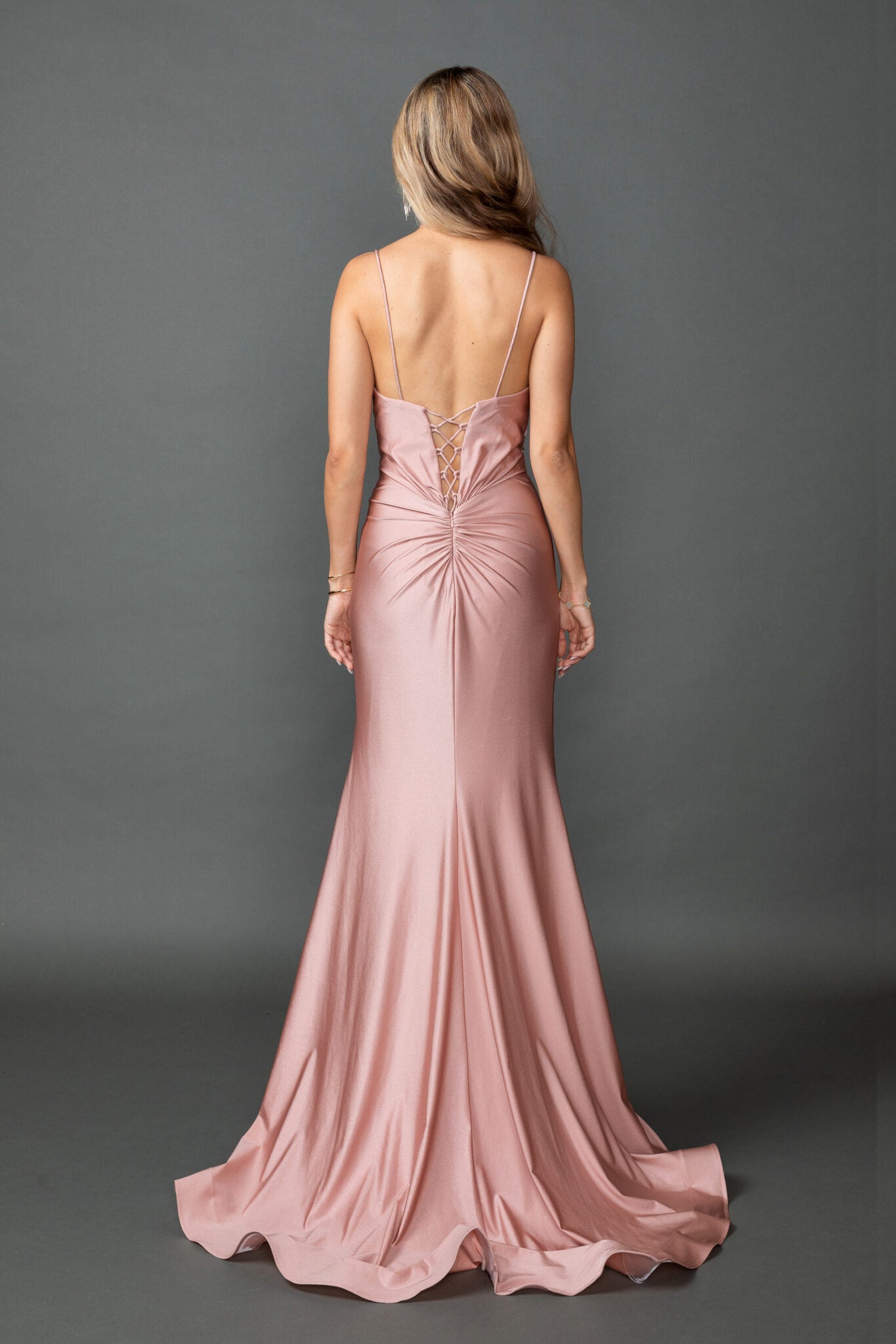 Designed to captivate, this Dancing Queen 4553 prom dress exudes sultry elegance with a refined, modern allure. Delicate spaghetti straps highlight a dramatic plunging V-neckline, drawing attention to the intricately beaded bodice that sparkles beautifully under the lights. The ruched fitted skirt hugs the figure flawlessly, enhancing natural curves while creating a sleek, polished silhouette that makes a striking statement from every angle.