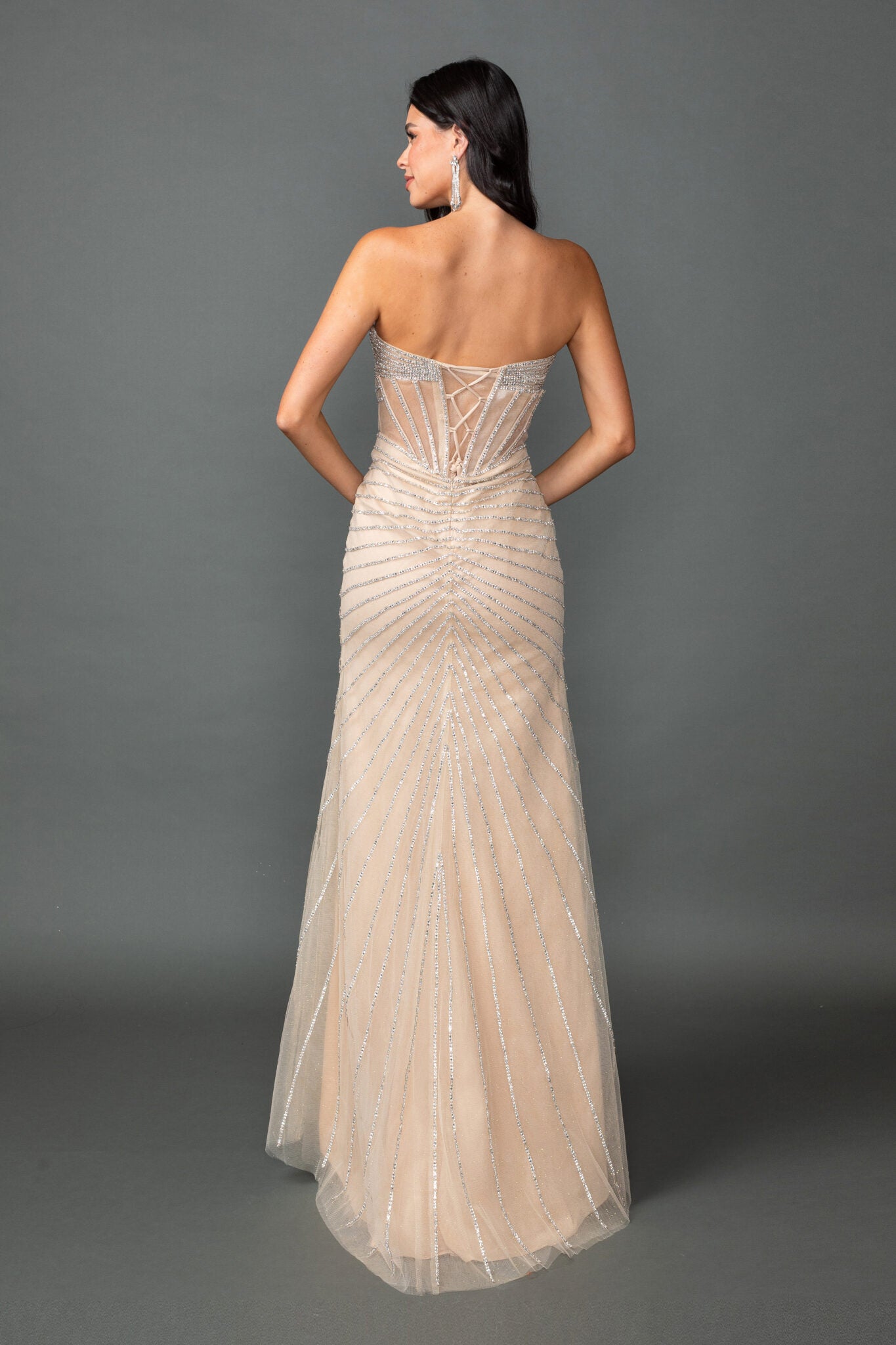 Shine with effortless elegance in this champagne strapless beaded mesh dress, designed to captivate under every light. The bodice and skirt are adorned with radiating embellishments that create a luminous, eye-catching effect from all angles. The strapless neckline highlights your shoulders, while the sleek silhouette flows into a front leg slit that adds a touch of modern allure. Perfect for prom or any formal occasion, this gown delivers a blend of soft glamour and timeless sophistication