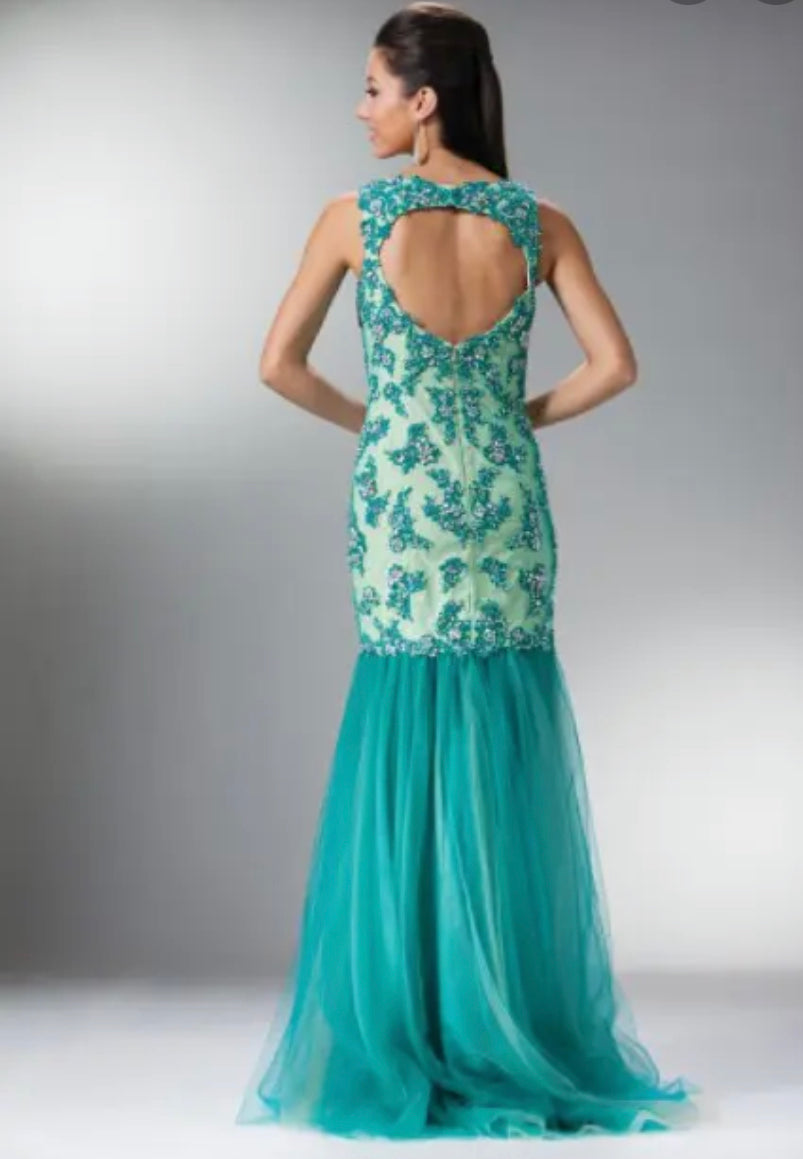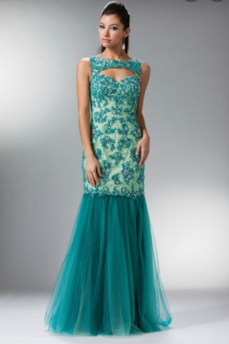 Mermaid silhouette gown fits and flares throughout your form. Sleek and streamlined; the sparkle embellished gown boasts a high neckline and a cut-out design across the chest. The dress falls gracefully into a chiffon skirted bottom with an cut-out back design.