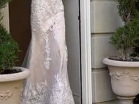 This fit & flare wedding gown highlights a dramatic plunging V-neckline framed by intricate floral lace appliqués that contour the bodice and extend seamlessly through the skirt. An illusion overlay adds depth and structure, creating a sculpted, figure-enhancing look. The gown features sheer lace sleeves, a striking open back detail, and a fitted skirt that flows into a delicate chapel-length train for a refined yet alluring finish. A timeless choice for the bride seeking elegance with a touch of bold romance.