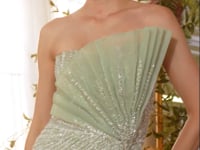 Exude elegance in this fitted gown, featuring a strapless neckline and an eye-catching asymmetrical pleated fan bodice that creates a striking silhouette. The pearl-beaded tulle over a soft lining adds a touch of luxury, while the wrap leg slit ensures graceful movement. With a structured bodice for support, this dress is perfect for black-tie events and formal occasions.