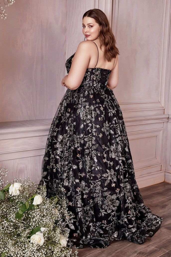 Escape to a secret garden in this luminescent floral sequin print ball gown. This A-line dress is designed with a deep v-neckline and thin supporting straps.