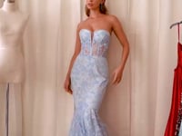 Make a statement in this strapless butterfly print corset bodice mermaid style gown.