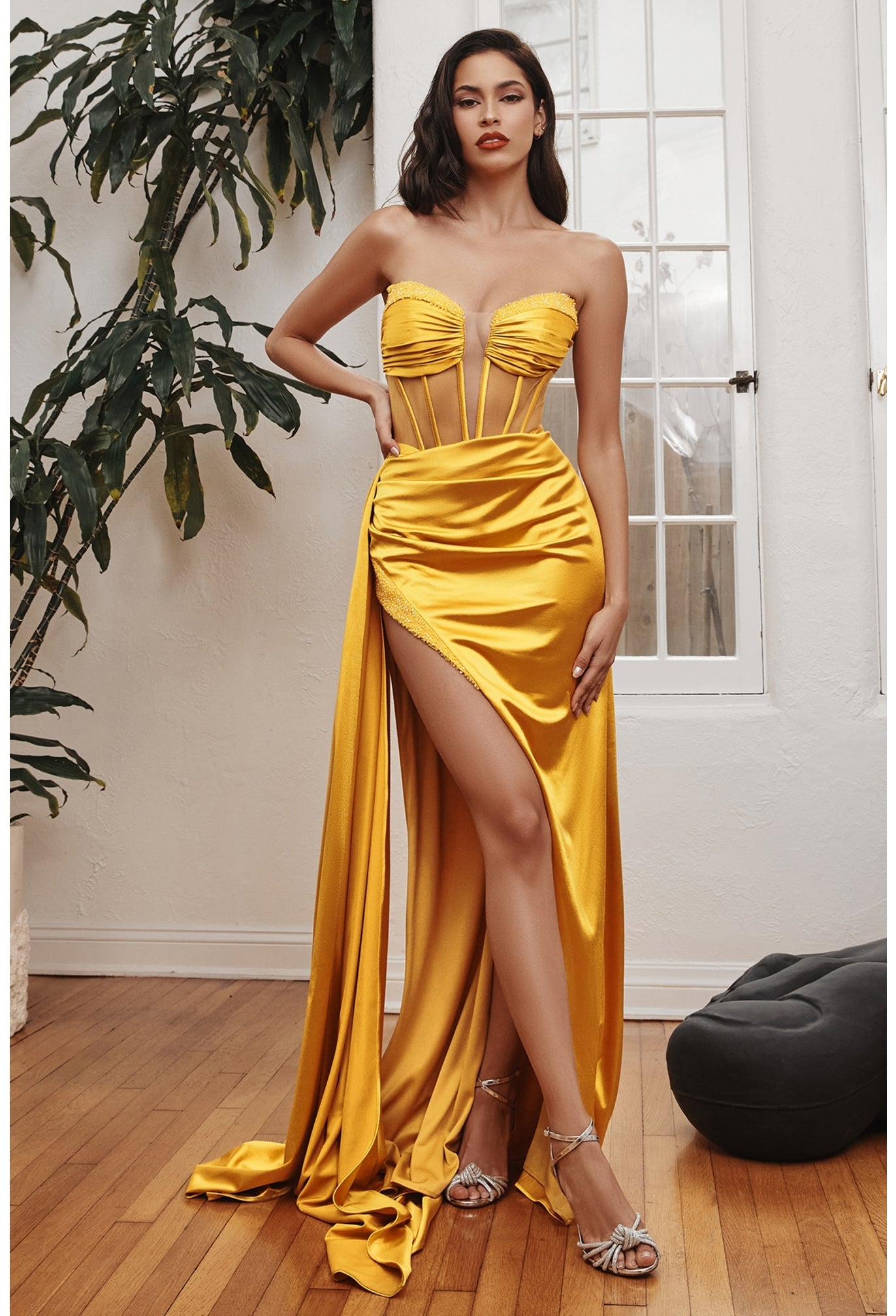 Make an entrance in a sexy, strapless corset satin gown! This gown combines glamour with fashion-forward style. The sheer boned corset offers structure and support without compromising on femininity, while the gathered bust edged in crystal beading give off a subtle sparkle. The plunging neckline will make heads turn when you walk into the room, and the gathered waistline with embellished side leg slit will show off your curves in all the right places. And to top it off, the gathered satin side sash adds a unique touch of elegance that is perfect for prom night or any special occasion.