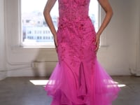 Make a statement in our mesmerizing mermaid gown tailored for the young and fabulous. The structured fitted bodice is a work of art, adorned with whimsical embellished lace appliqué that adds a touch of romance to your look. Appliquéd straps delicately frame your shoulders, striking the perfect balance between elegance and modern flair. The full-layered trumpet skirt cascades gracefully, creating a dramatic silhouette that's both chic and playful. Dance the night away with confidence, as a tasteful leg slit adds a touch of flirtation to this show-stopping ensemble. This gown is more than a dress; it's a celebration of your youthful spirit and vibrant charm. Embrace the spotlight and let your confidence shine in this stunning creation that's as unique and fabulous as you are.