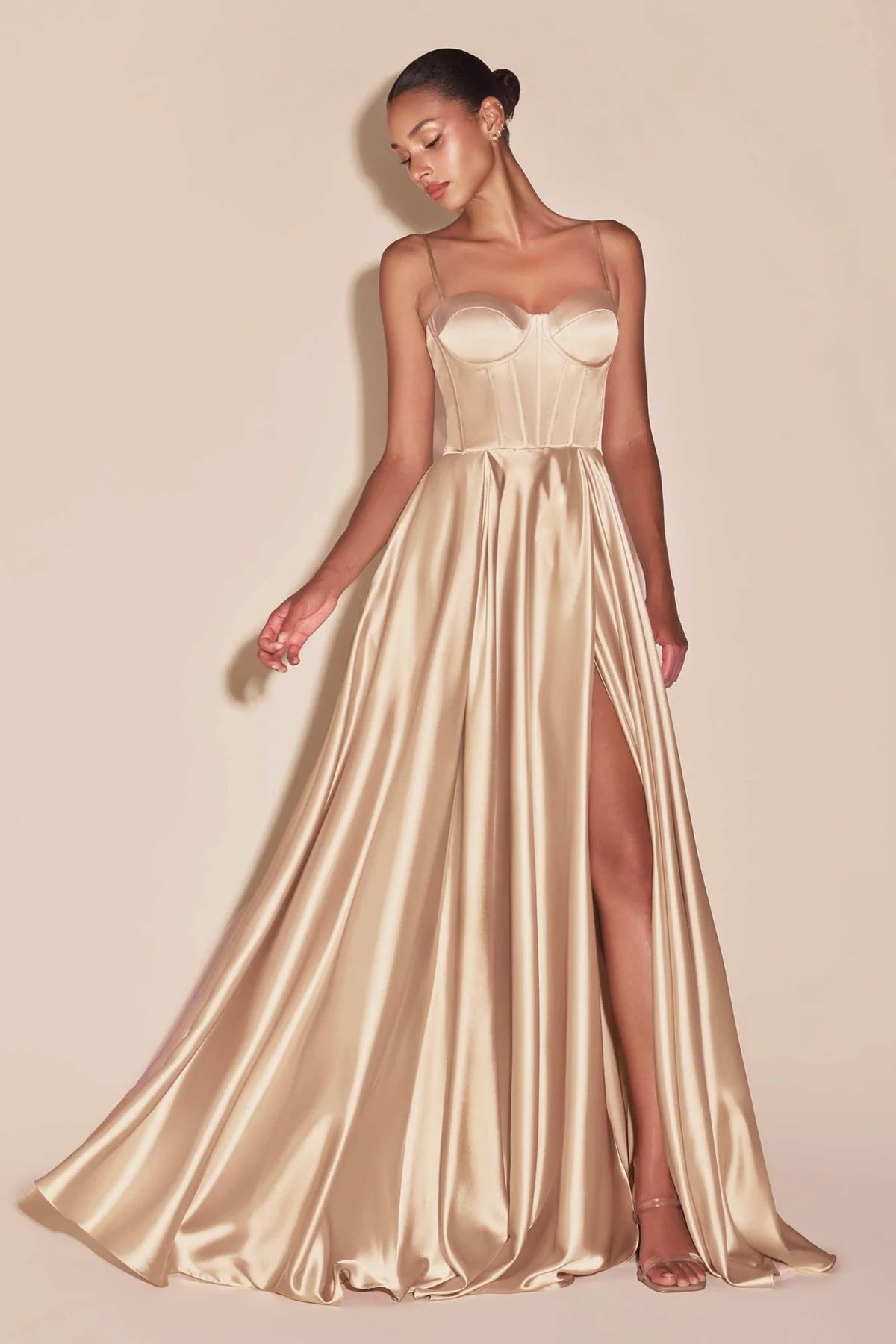 Make a statement in this timeless satin A-line bustier dress. With a classic and elegant feel, this exquisite dress will never go out of style. Its A-line silhouette cascades in a beautiful flow, and the satin fabrication is divinely soft to the touch. The thin straps offer a delicate femininity, and the boned corset bodice provides a stunning and sophisticated look. Add a hint of allure with the sophisticated leg slit. Perfect for a romantic dinner date or a special night out, this divine dress will surely turn heads. Experience exquisite style with this classic and elegant satin A-line bustier dress.