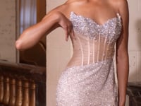 - Fabric & Material: Crystal-embellished tulle with sheer corset bodice