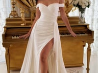 This draped off the shoulder bridal gown is the perfect dress for the simple bride dreaming of her romantic wedding day. Crafted from a luxe off white stretch satin, this modern and tasteful piece casts grace and elegance. The fitted silhouette hugs the body and leads to an attached tiered overskirt that cascades in grace. The gathered waistline adds a classic touch while the leg slit affords a subtle glimpse of skin as you glide through the room. To complete the look, a center back zipper closure ensures an effortless fit with maximum comfort. Turn heads on your big day in this beautiful draped off the shoulder bridal gown!